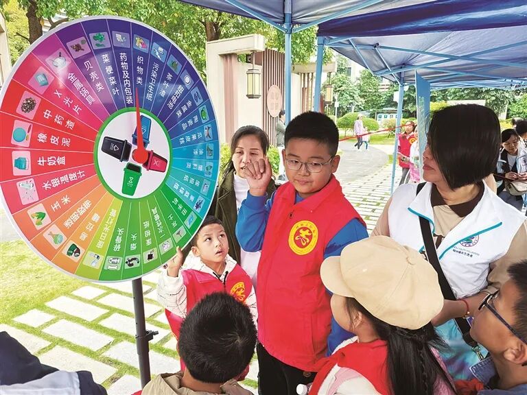 當(dāng)天的活動中,“環(huán)小青”志愿者向市民發(fā)放垃圾分類宣傳手冊,耐心地為市民普及垃圾分類知識,現(xiàn)場還設(shè)置有趣味垃圾分類游戲、可回收物綠色兌換區(qū),提高市民參與活動的積極性。