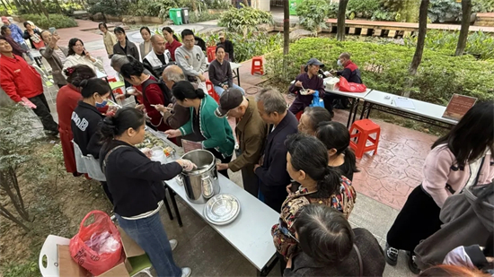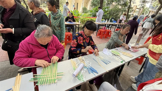 隨后,“老友集市”熱鬧開啟,成為活動亮點。特色體驗區(qū)里,老人親手制作手工竹編扇,感受傳統(tǒng)手工藝韻味,還能品嘗轄區(qū)商家提供的“老火湯”與特色美食,拉近鄰里距離;普法知識有獎問答點,通過互動普及法律常識,答對者獲小禮品;便民服務攤位更顯貼心,志愿者免費為老人理發(fā),社區(qū)醫(yī)生提供血壓測量、中醫(yī)診脈與健康咨詢,小區(qū)物業(yè)志愿者則免費磨刀,切實解決居民需求。