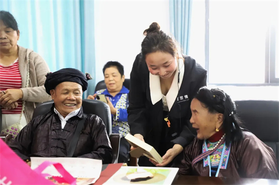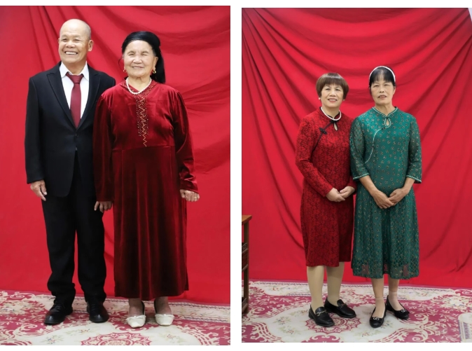 活動現(xiàn)場,參與者們在志愿者引導(dǎo)下有序簽到入場領(lǐng)取伴手禮。隨后,專業(yè)化妝師為每一位參與者打造貼合年齡與氣質(zhì)的造型,并根據(jù)喜好,為他們分別換上極具特色的民族婚禮服裝、婚紗或禮服。換裝后的叔叔阿姨們看著彼此的樣子,眼中滿是笑意。