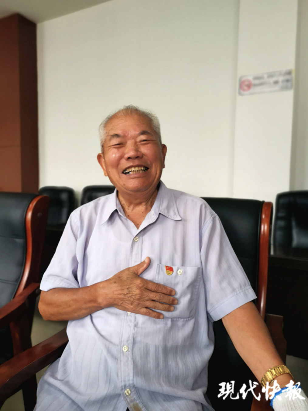 張老摸著胸前黨徽開心地笑。圖片來源:現(xiàn)代快報