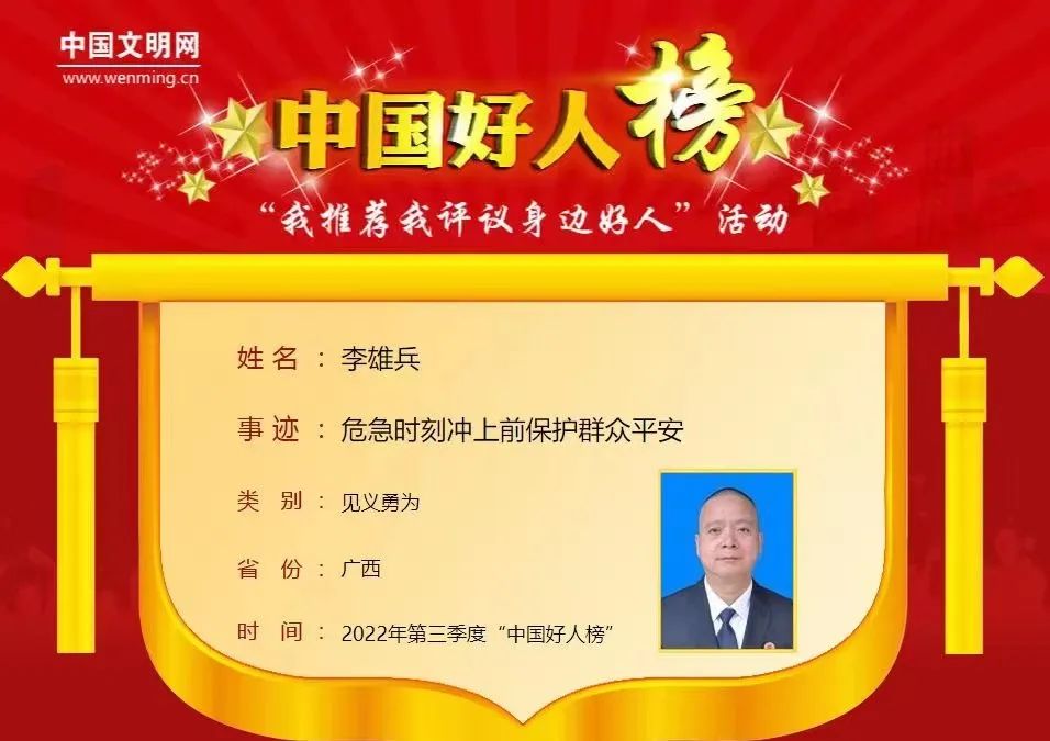 李雄兵,男,1973年4月生,中共黨員,廣西壯族自治區(qū)柳州市柳北區(qū)鋼城司法所所長(zhǎng)。2022年4月,有居民酒后滋事,李雄兵毫無(wú)畏懼,不顧個(gè)人安危保護(hù)群眾安全,為社會(huì)傳遞了滿滿的正能量。